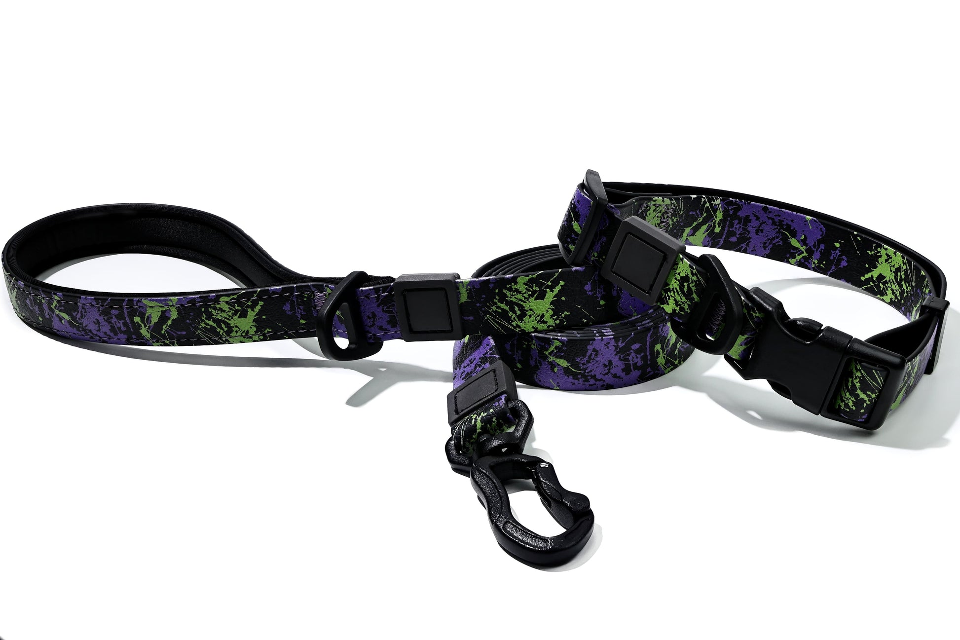 The core highlight of the set lies in the UV embossed printing technology on the surface of the rope. Through multiple precise layers of UV white ink, followed by covering trendy camouflage color patterns and texts, the final pattern not only has rich and vivid colors but also excellent durability, which is not easy to fade even with daily friction. The unique embossed texture brings a distinct three-dimensional effect, making it highly recognizable visually. At the same time, the three-dimensional patterns can effectively enhance the grip, so that the owner is not easy to slip when holding it, and the control of the pet's traction is more stable.